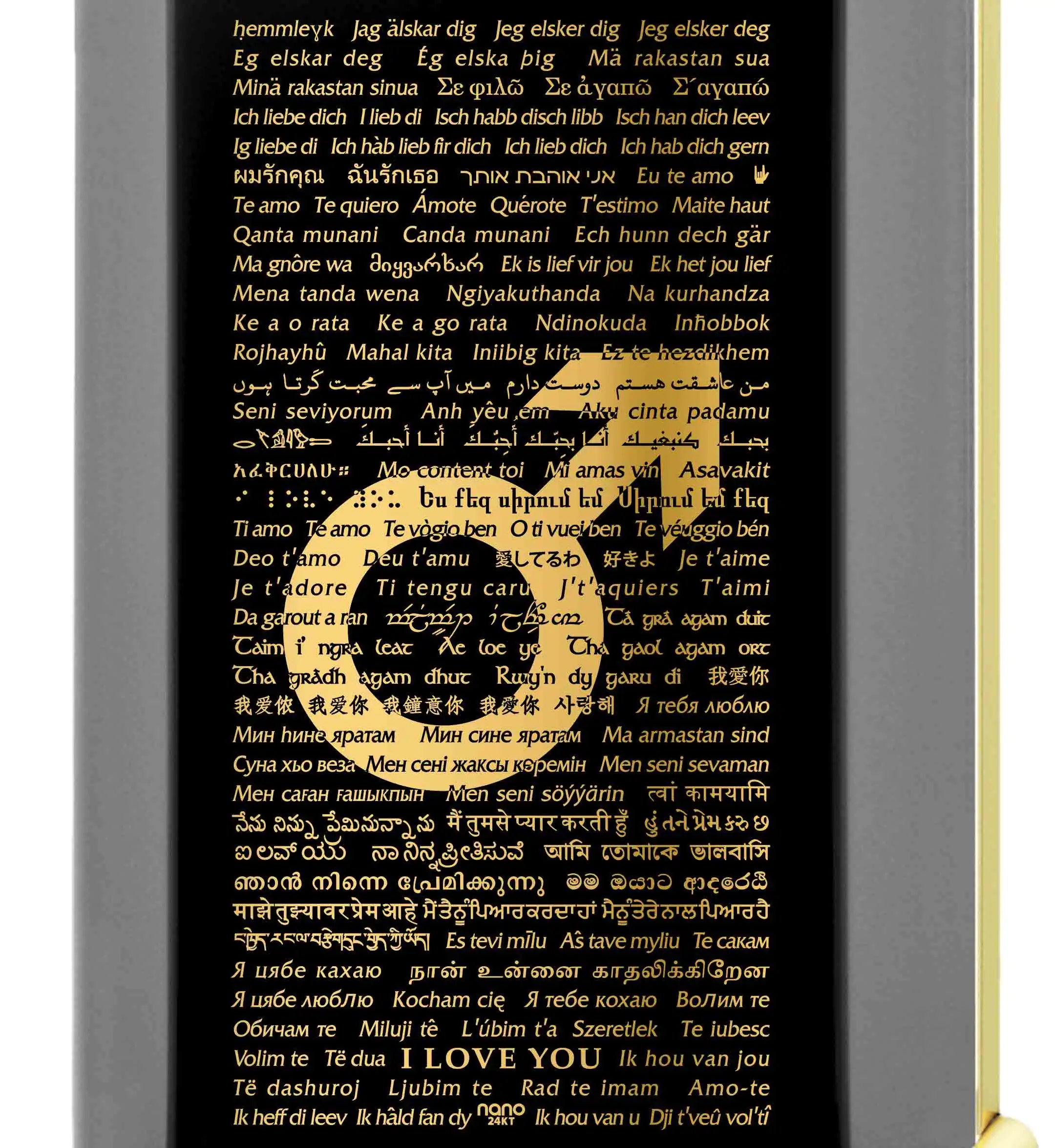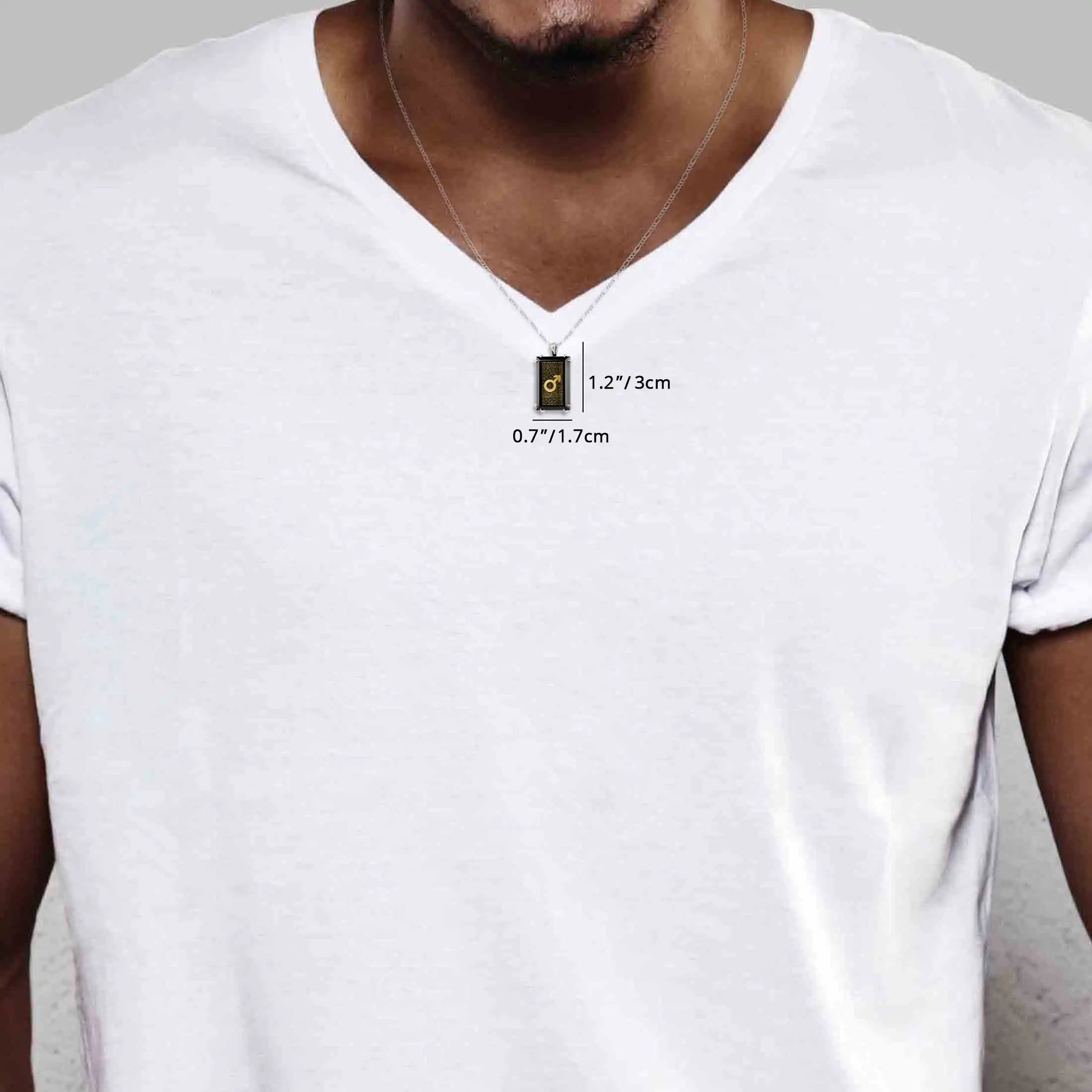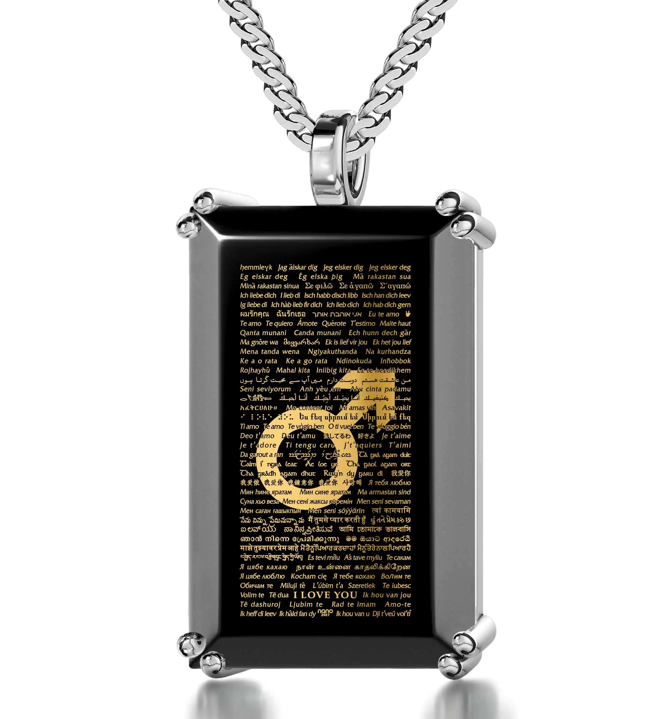 Embrace the power of love and individuality with our unique necklace that artfully spells “I love you” in 120 languages, intricately inscribed within the male Mars symbol. This intricate design is elegantly rendered in 24k gold on a rectangular black onyx gemstone, adorned with precision prong setting and suspended from a high-quality 20″ (50cm) curb chain, available in your choice of 925 sterling silver or gold-plated silver. A heartfelt gift that transcends occasions, surprise the man in your life – whether husband, boyfriend, or dad – with this extraordinary token of unconditional love, a perfect blend of sentiment and artistry.