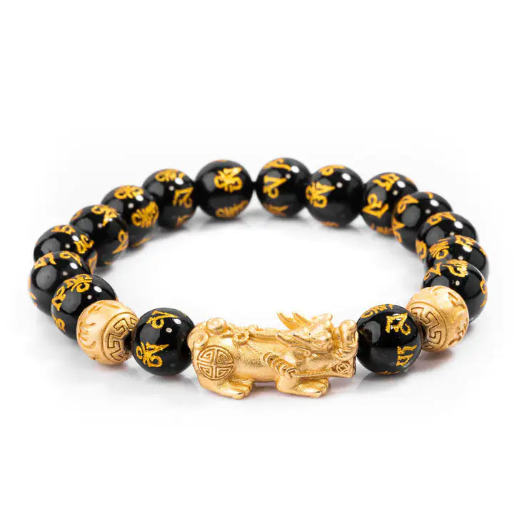 The Wealth Attractor Feng Shui Black Obsidian Bracelet is the perfect accessory to whisk away your worries and bring in fortune, luck, and happiness. It is carefully handcrafted with Pixiu and Obsidian—powerful Chinese talismans that provide a minimum of six blessings: generating good Feng Shui or earth luck; enhancing wealth and riches; protecting individuals and buildings against evil forces, obstacles, and hardships; bringing unexpected windfall luck; creating an overall feeling of good fortune, and also cleansing and aligning all chakras. This versatile bracelet can be worn or held for its positive effects in any situation—whether it’s in your daily life or while meditating or praying. With this dynamic bracelet on your arm, you can feel confident you’ll benefit from improved emotional calmness as well as spiritual protection. When you need extra reassurance that fortune will come your way, The Wealth Attractor Feng Shui Black Obsidian Bracelet is sure to deliver!